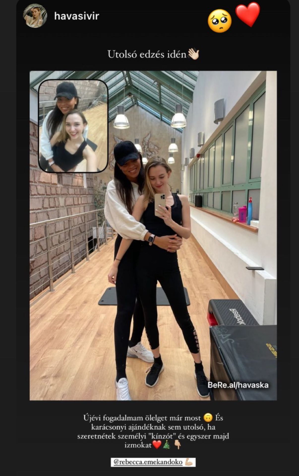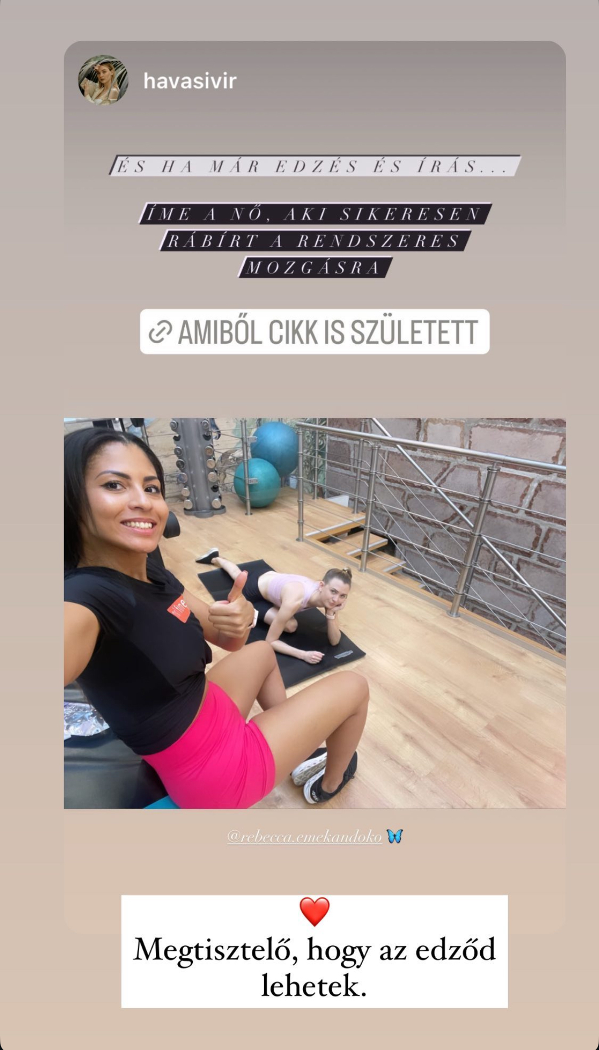 „2023 februárjába kezdtük meg a közös átalakulást Rebivel. Ő volt az aki elindított egy olyan úton amiről még mindig nem tértem le és nem is fogok. Neki köszönhetően megtanultam a helyes edzést, a helyes étkezést és ami a legfontosabb egy nő életébe megtanultam tisztelni és szeretni a testem. Személyre szabottan alakította és mentorálta az edzésemet. Támogatott, segített a nehezebb időszakokba, amikor a súlyom stagnált és esetlegesen megingott a kitartásom.Ő nem hagyta,hogy feladjam!